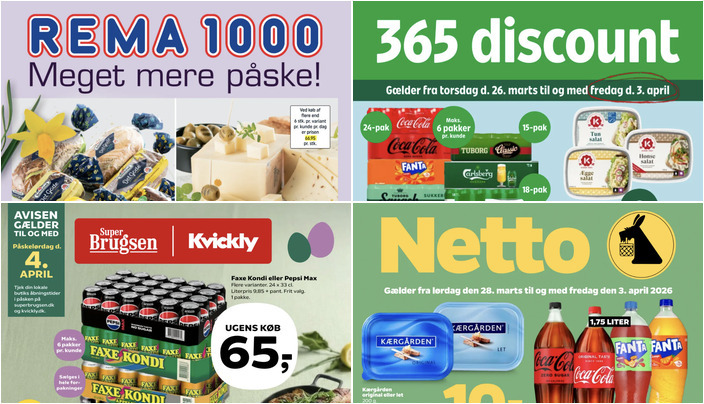 Coop365 tilbyder forskellige pakker af Coca-Cola, Fanta, Tuborg Squash eller Carlsberg, Tuborg til en pris på kun 59 kr. pr. pakke. Husk, der er en begrænsning på maks. 6 pakker pr. kunde. Tilbuddet gælder fra torsdag 26. marts til fredag 3. april.