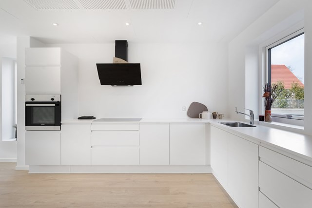 Den indbydende entre indeholder et teknikskab, og badeværelset i stueetagen tilbyder vaskefaciliteter uden spildplads. Det store køkken/alrum har hvide elementer fra HTH og er i åben forbindelse med alrummet, som har god spiseplads til hele familien.