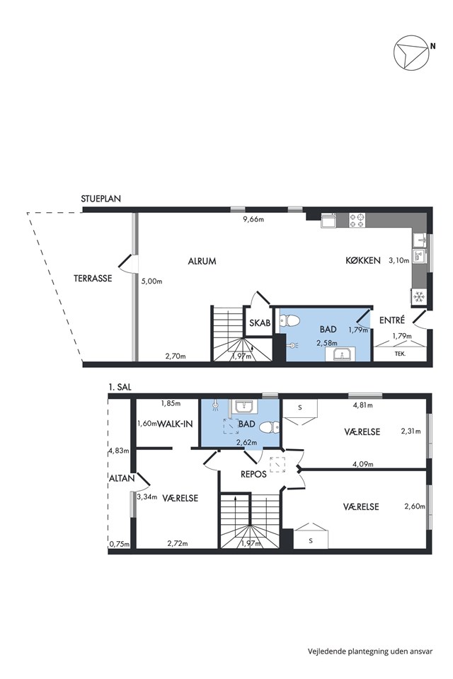 1. sal indeholder to store børneværelser med mange indretningsmuligheder samt et dejligt forældresoveværelse med separat walk-in garderobe og udgang til en altanterrasse med glasværn.